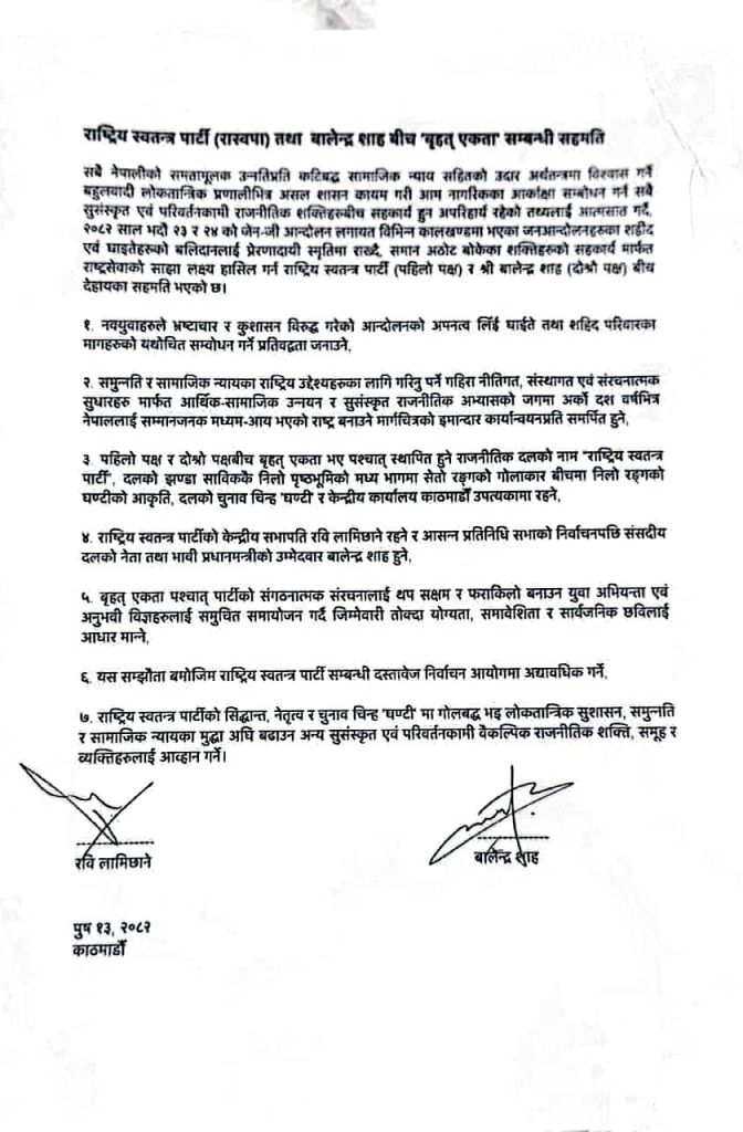 काठमाडौँ। राष्ट्रिय स्वतन्त्र पार्टी (रास्वपा) का सभापति रवि लामिछाने र काठमाडौँ महानगरपालिकाका प्रमुख बालेन्द्र शाहबीच ‘बृहत् एकता’ सम्बन्धी ७ बुँदे सहमति भएको छ। सहमति अनुसार रवि लामिछाने रास्वपाको केन्द्रीय सभापति रहनेछन् भने आगामी प्रतिनिधिसभा निर्वाचनपछि बालेन शाहलाई संसदीय दलको नेता तथा भावी प्रधानमन्त्रीको उम्मेदवारका रूपमा अघि सारिनेछ।