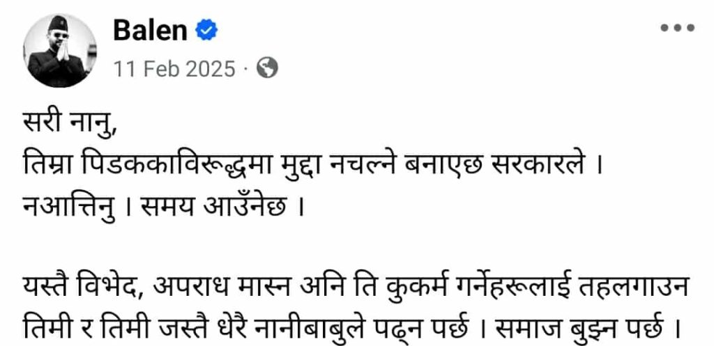महानगरले पटक-पटक ध्यानाकर्षण गराउँदा पनि कारबाही नभएपछि तत्कालीन मेयर बालेन्द्र शाहले २०८१ माघ २९ गते सामाजिक सञ्जालमार्फत पीडित बालिकासँग क्षमायाचना गरेका थिए। उनले “सरी नानु, तिम्रा पीडकका विरुद्धमा मुद्दा नचल्ने बनाएछ सरकारले, नआत्तिनू, समय आउनेछ” भन्दै आक्रोश व्यक्त गरेका थिए।